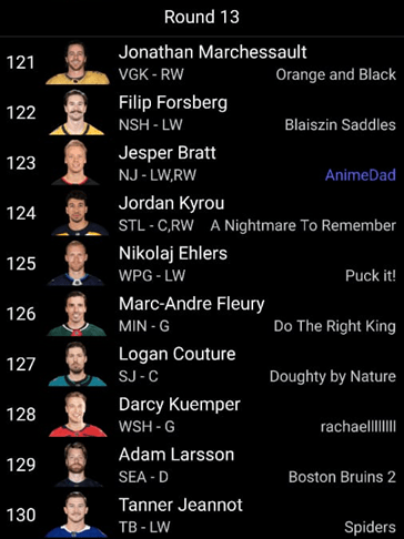 I’m a bad man. I feel like I’m stealing money from these poor people. Konecny at round 15?! What in the blue hell, man?! I don’t think he’ll have the season he had last year, but the dude is still pure value here, especially since he’s a RW. Torts just loves playing him, he scores goals, he gets hits, and he loves sitting in the penalty box. Shout out to the guy who got Nichushkin here as well as Buchnevich; all three of these guys are steals!