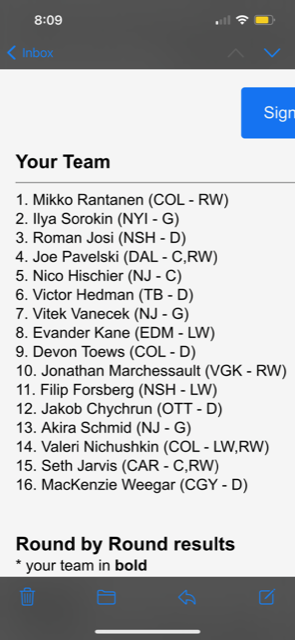 After drafting a “stud” high-volume goalie, I wanted to secure any of the following tandems: Adin Hill and Logan Thompson (Vegas), Vitek Vanecek and Akira Schmid (NJ), or Ilya Samsonov and Joseph Woll (TOR). The thinking here was based on “team context” with a nod toward Zero-G, i.e, draft a tandem from a team that’s a. projected to do well, and b. may have a backup that will potentially play significant time and or have the chance of becoming the starter.