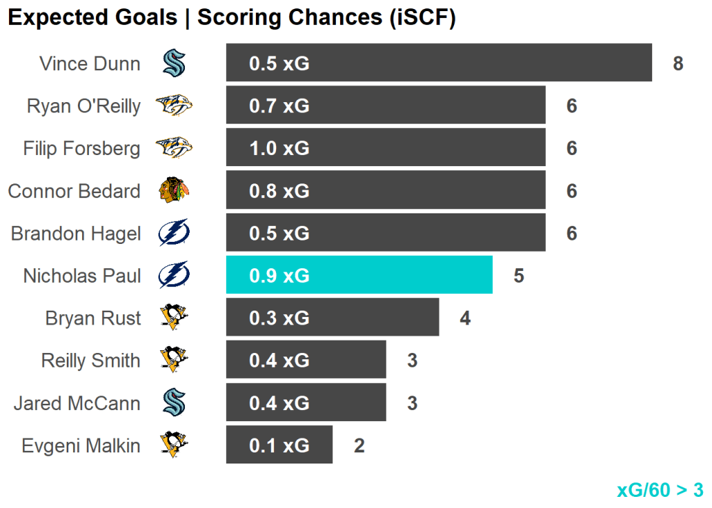 | Skater | Team | Shots | Shots/60 | Chances | xGoals |