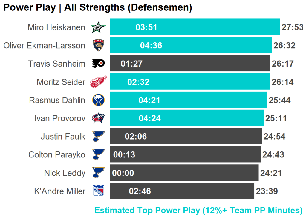| Justin Faulk | St. Louis Blues | 5 | 12.05 | 3 | 0.27 |