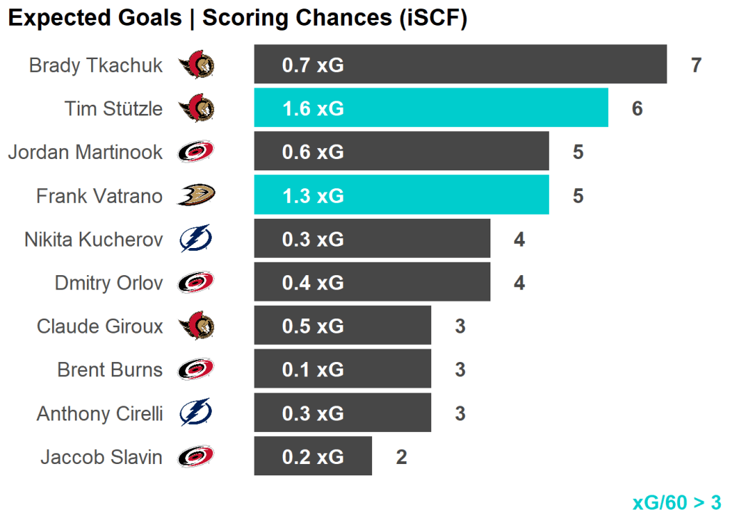 | Skater | Team | Shots | Shots/60 | Chances | xGoals |