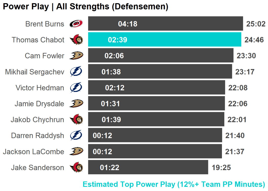 | Mathieu Joseph | Ottawa Senators | 3 | 10.21 | 2 | 0.18 |