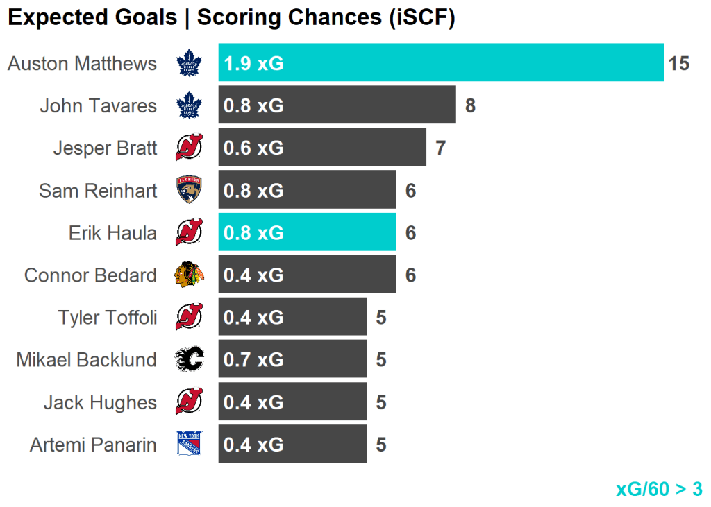 | Skater | Team | Shots | Shots/60 | Chances | xGoals |