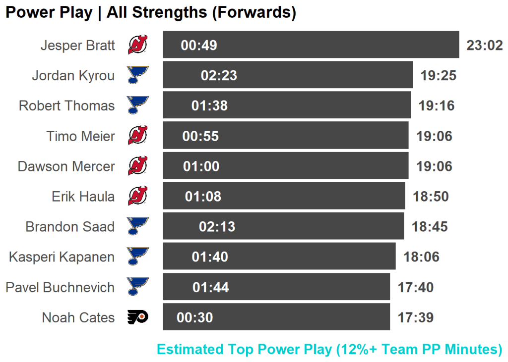 | Alexander Holtz | New Jersey Devils | 01:06 | 11.0 | 5.1 | 5.9 |