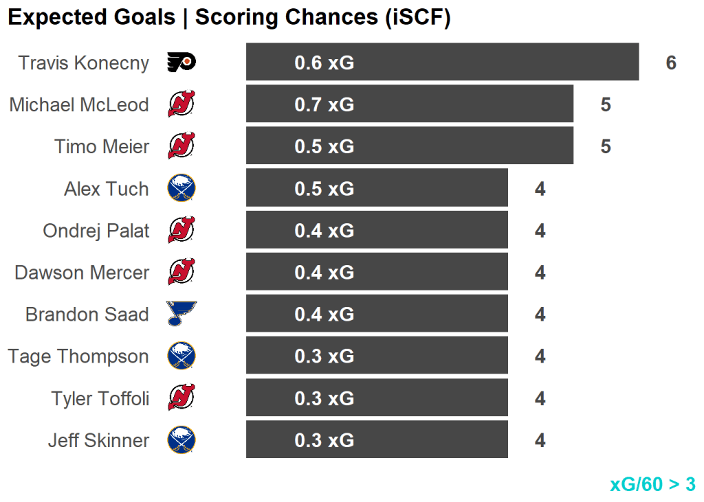 | Timo Meier | New Jersey Devils | 7 | 21.99 | 5 | 0.49 |