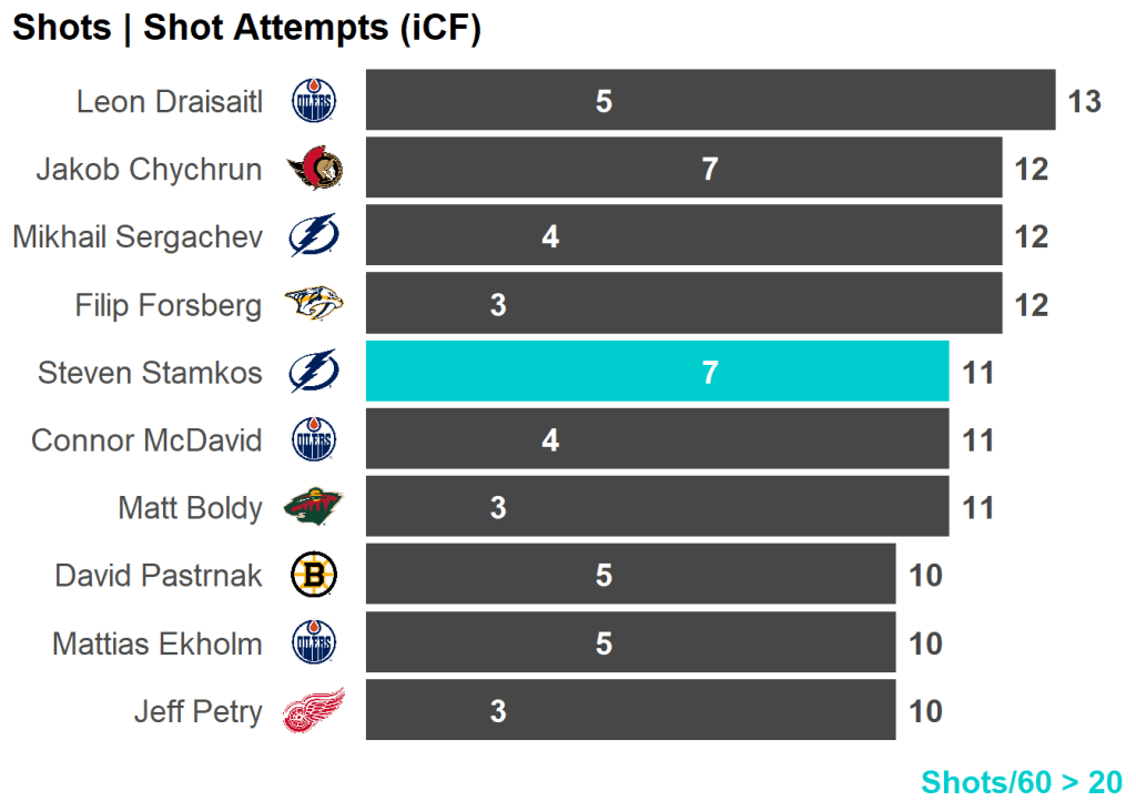 | Steven Stamkos | Tampa Bay Lightning | 7 | 22.60 | 10 | 1.30 |