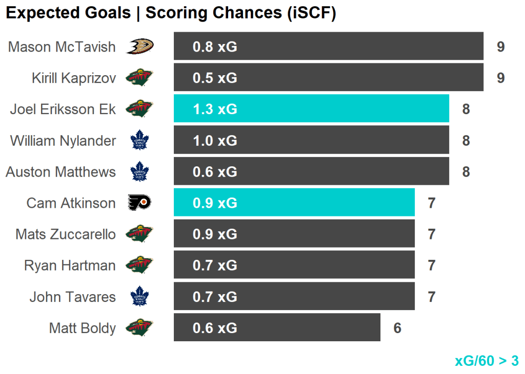 | Joel Eriksson Ek | Minnesota Wild | 7 | 21.23 | 8 | 1.28 |