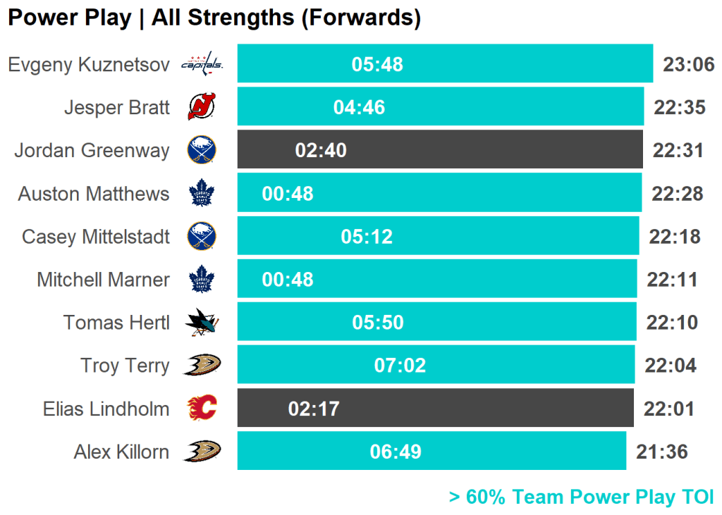 | Skater | Team | PP TOI | Percent | Last 3 GP | Difference |