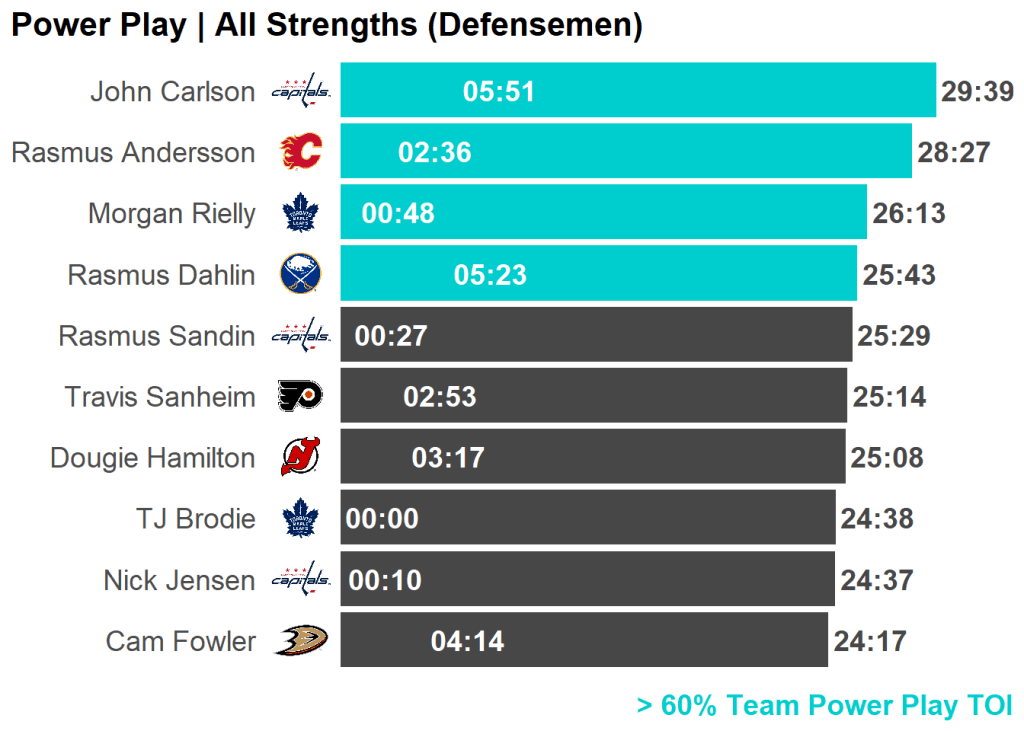 | Morgan Rielly | Toronto Maple Leafs | 00:48 | 100.0 | 59.4 | 40.6 |