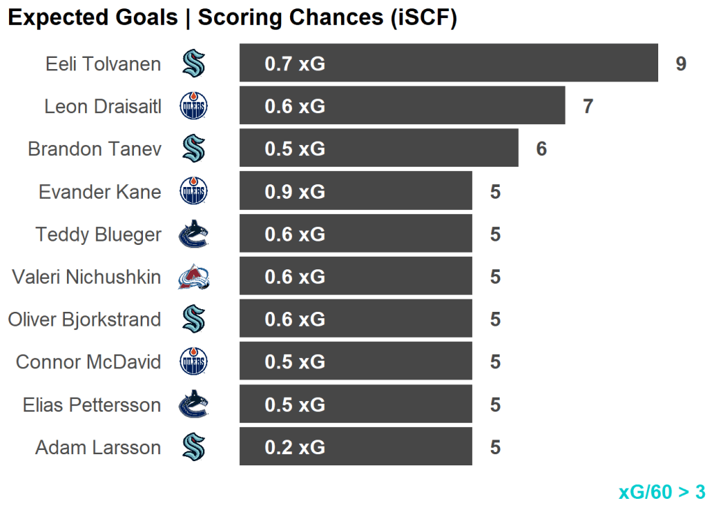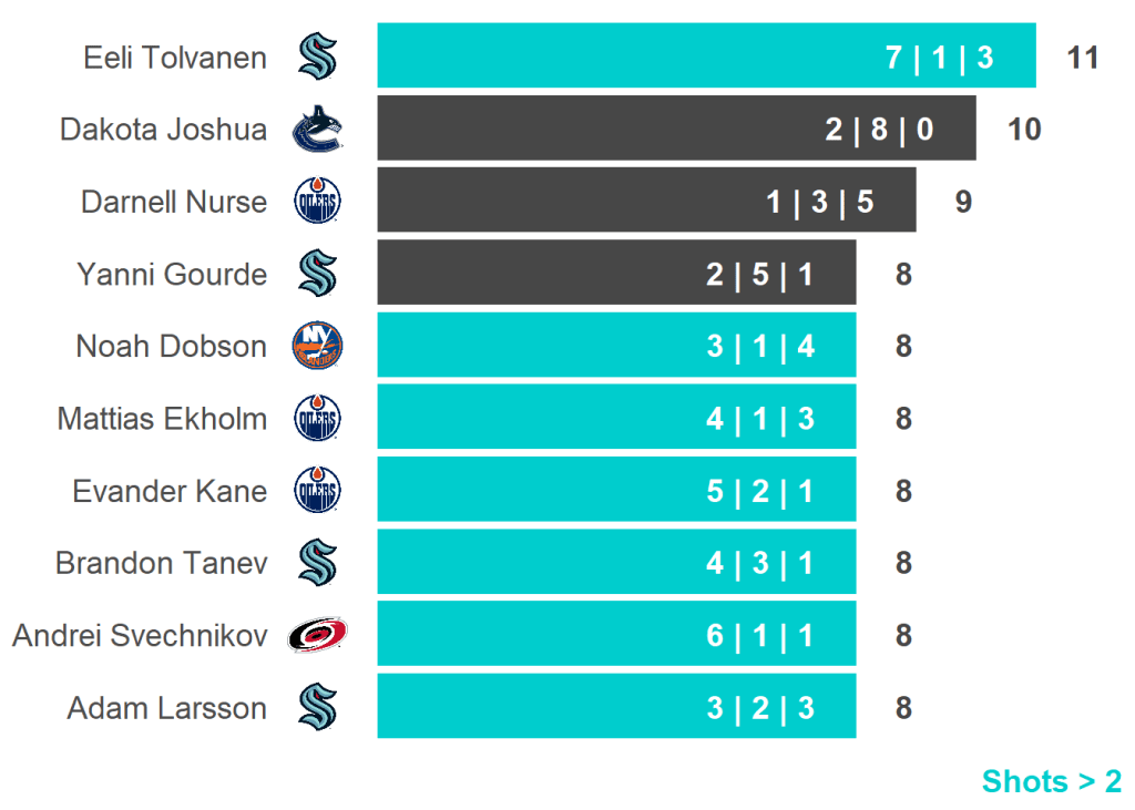 | Oliver Bjorkstrand | Seattle Kraken | 2 | 7.52 | 5 | 0.55 |