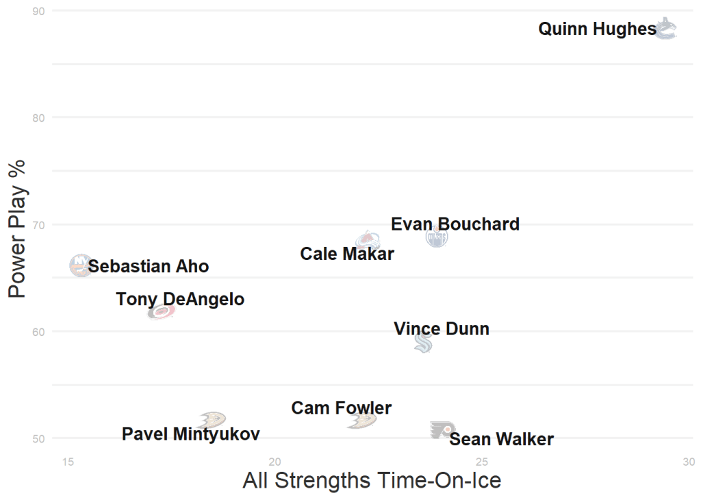 | Quinn Hughes | Vancouver Canucks | 6 | 12.24 | 3 | 0.25 |