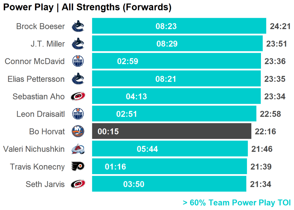 | Bo Horvat | New York Islanders | 3 | 8.08 | 3 | 0.67 |