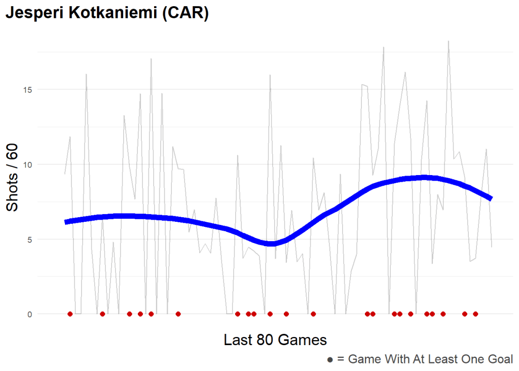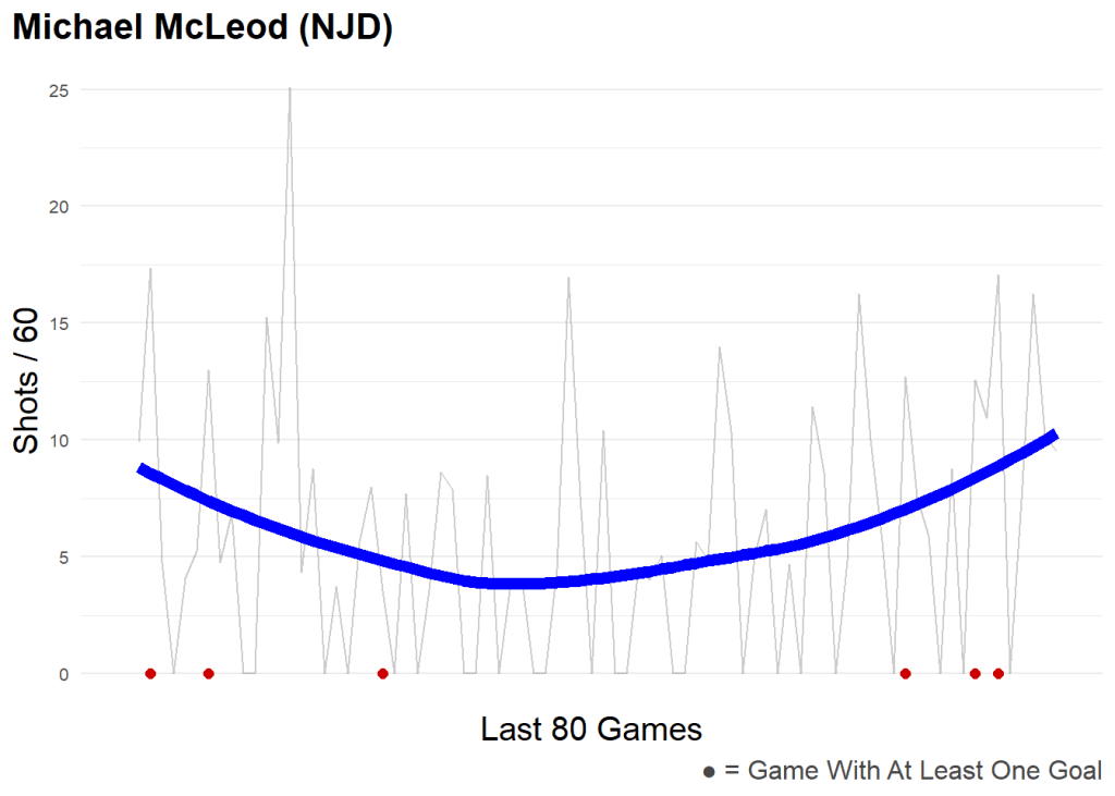 Under-26 skaters with a rising shot rate in the last 20 GP versus the last 80 GP.