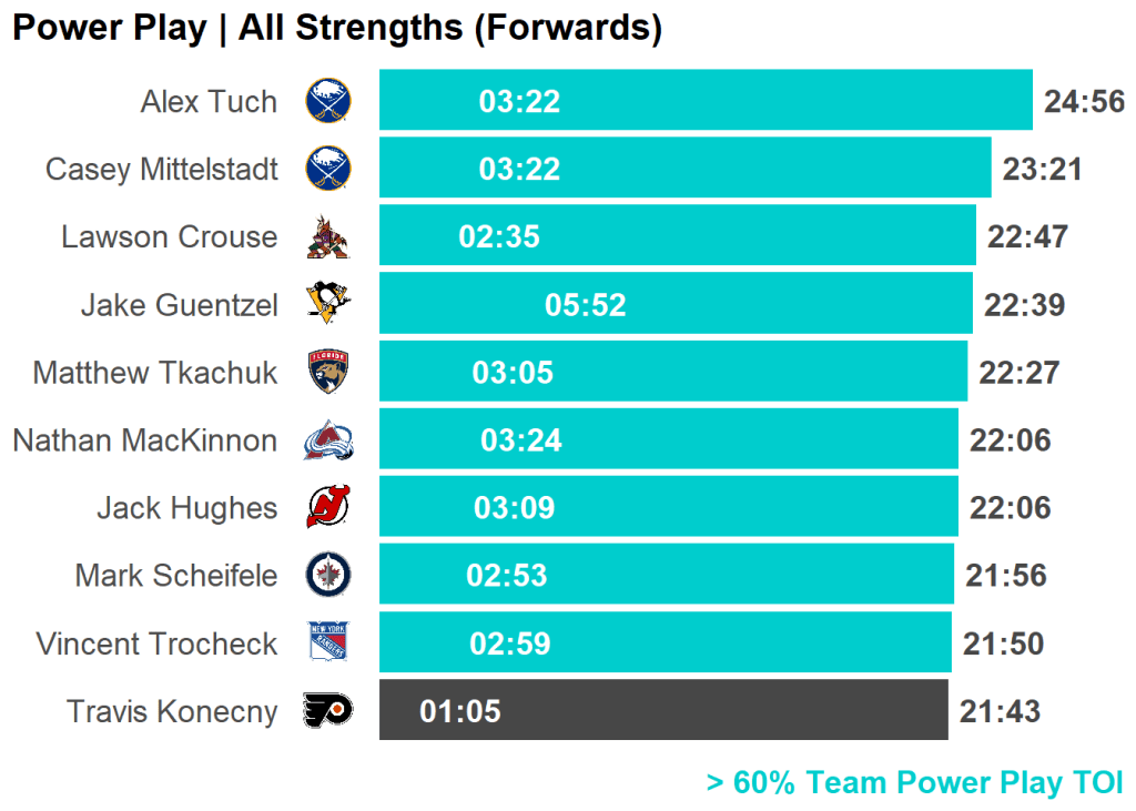 | Skater | Team | PP TOI | Percent | Last 3 GP | Difference |