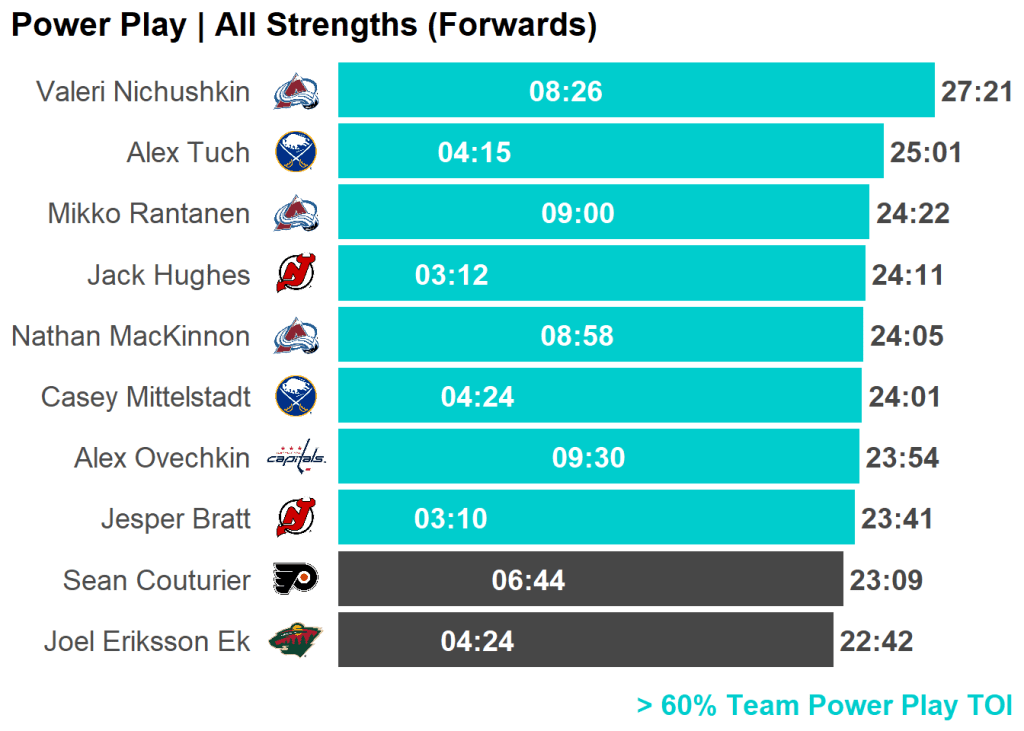 | Skater | Team | PP TOI | Percent | Last 3 GP | Difference |