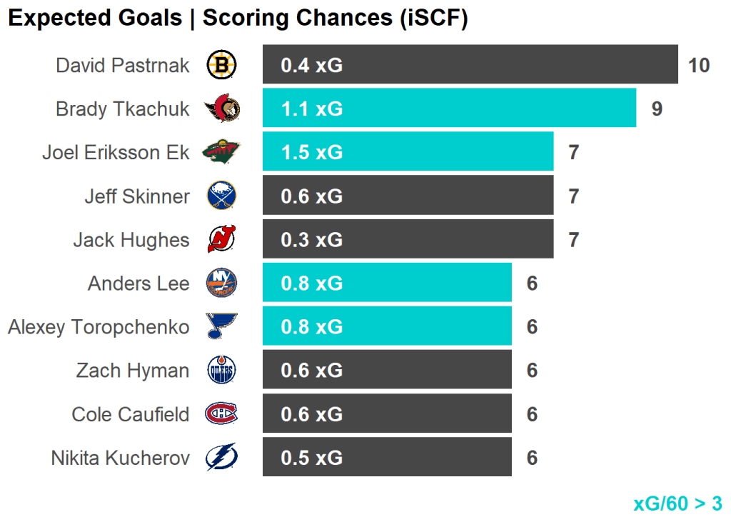 | Skater | Team | Shots | Shots/60 | Chances | xGoals |