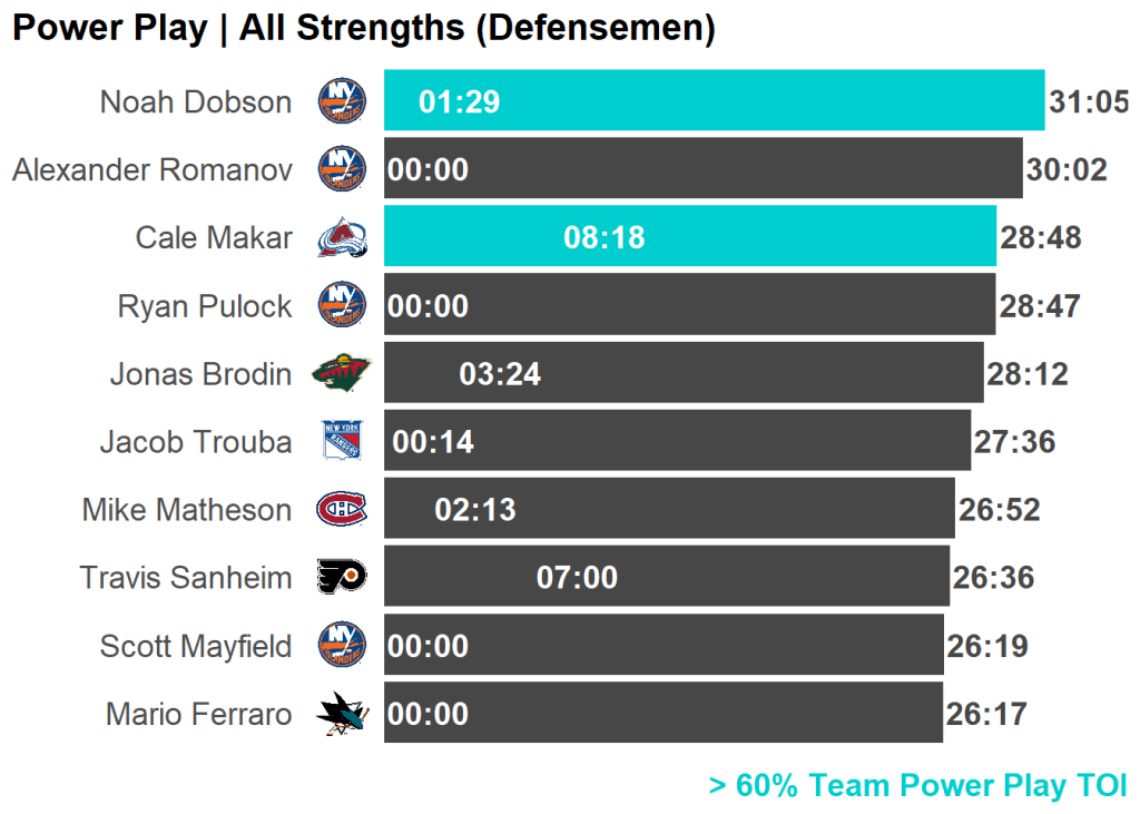 | Scott Mayfield | New York Islanders | 3 | 6.84 | 2 | 0.09 |