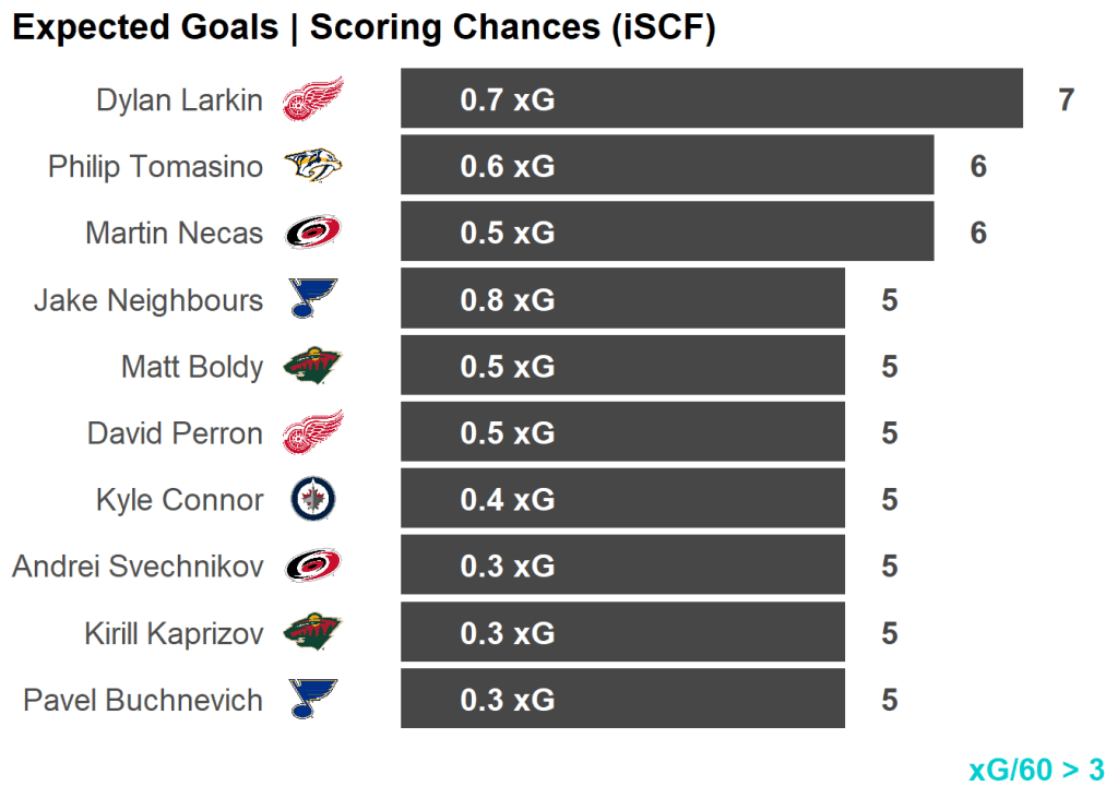 | Skater | Team | Shots | Shots/60 | Chances | xGoals |