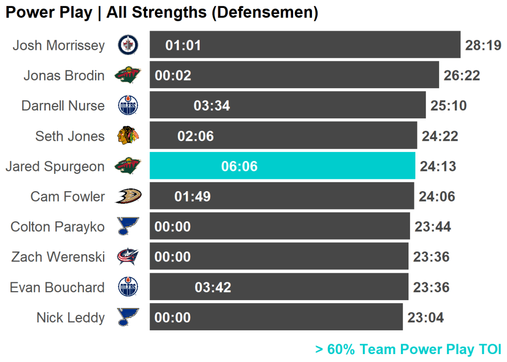 | Jared Spurgeon | Minnesota Wild | 4 | 9.91 | 1 | 0.12 |