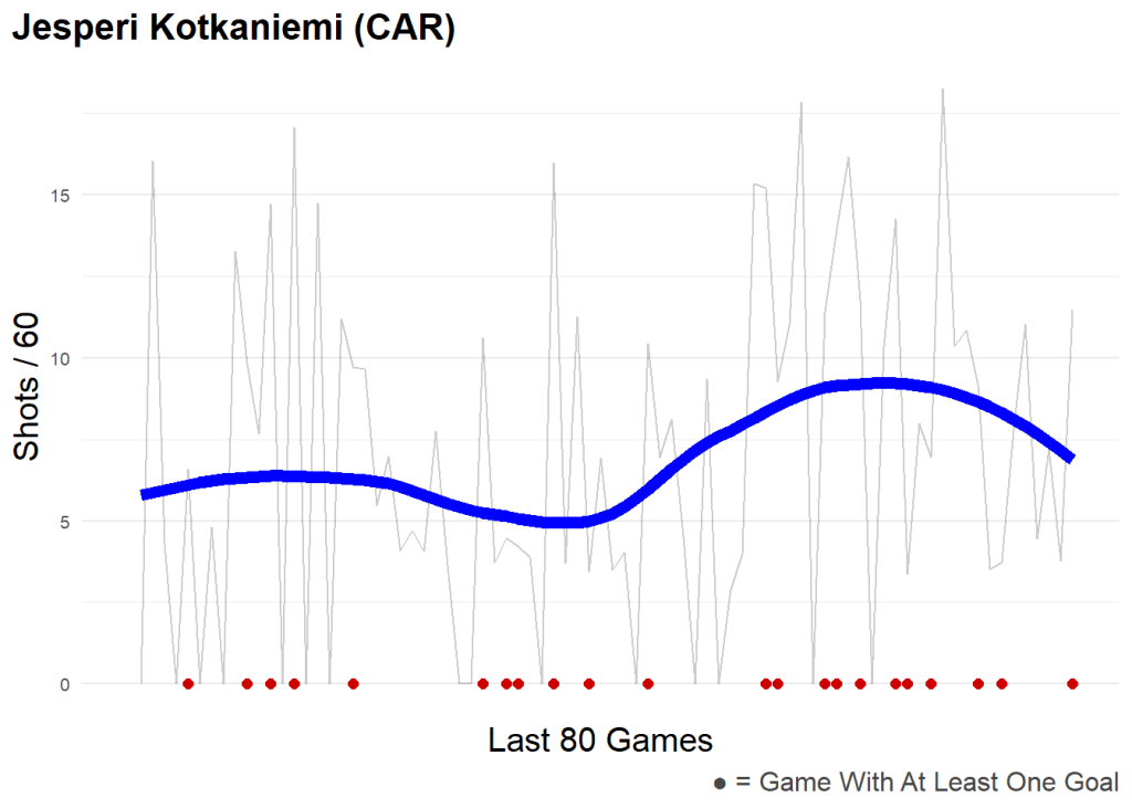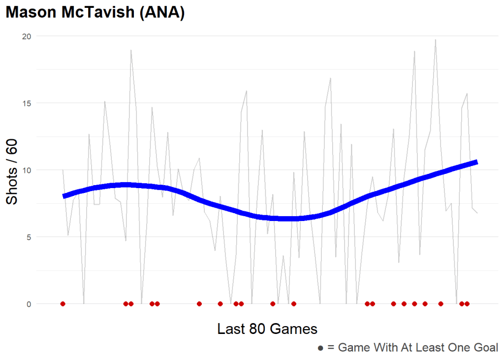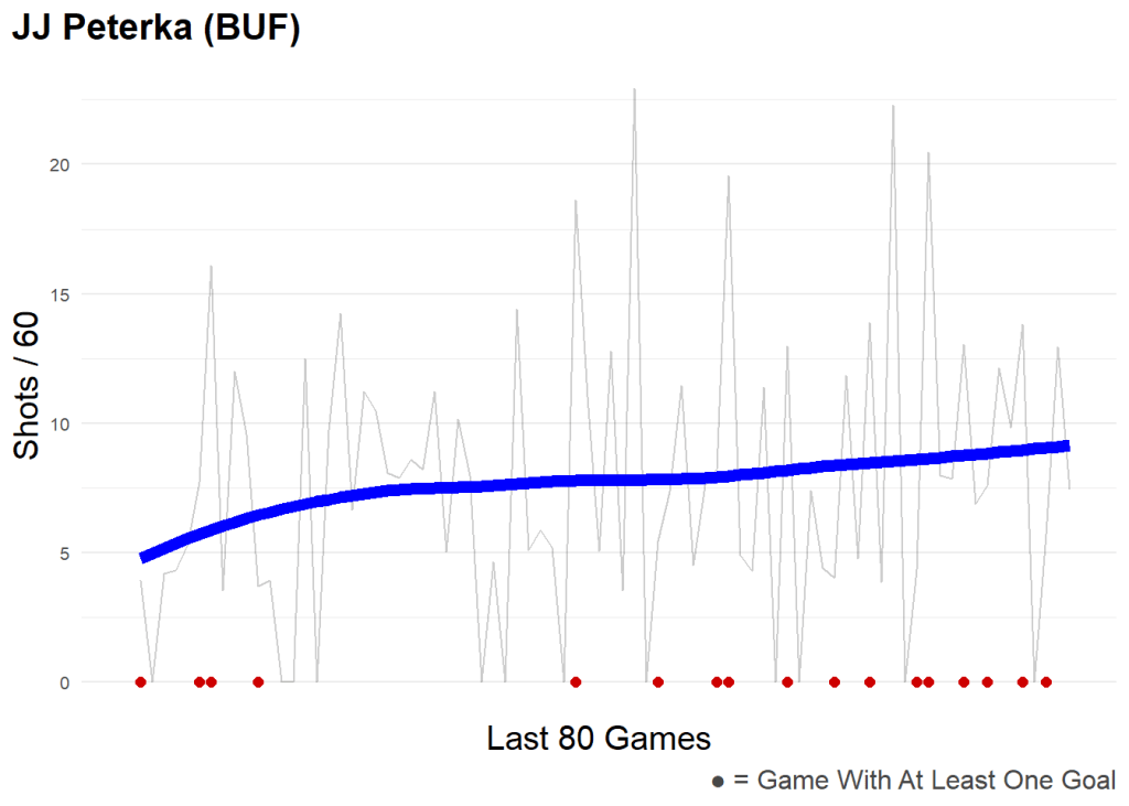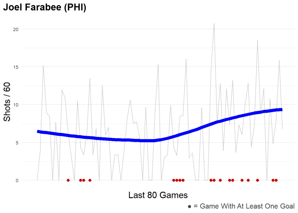 Under-26 skaters with a rising shot rate in the last 20 GP versus the last 80 GP.