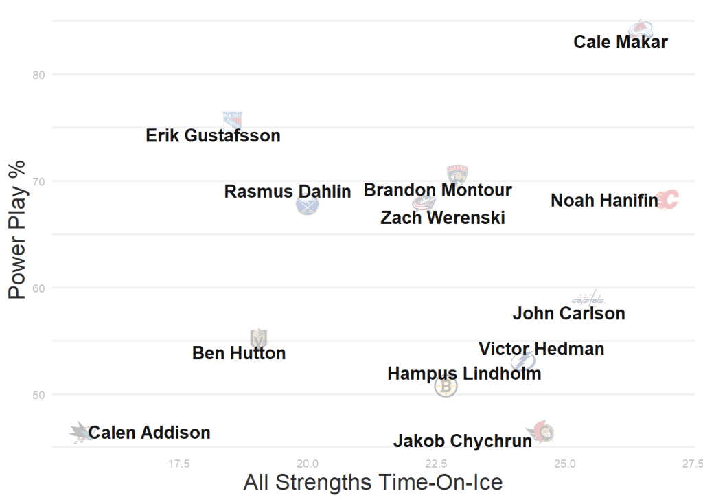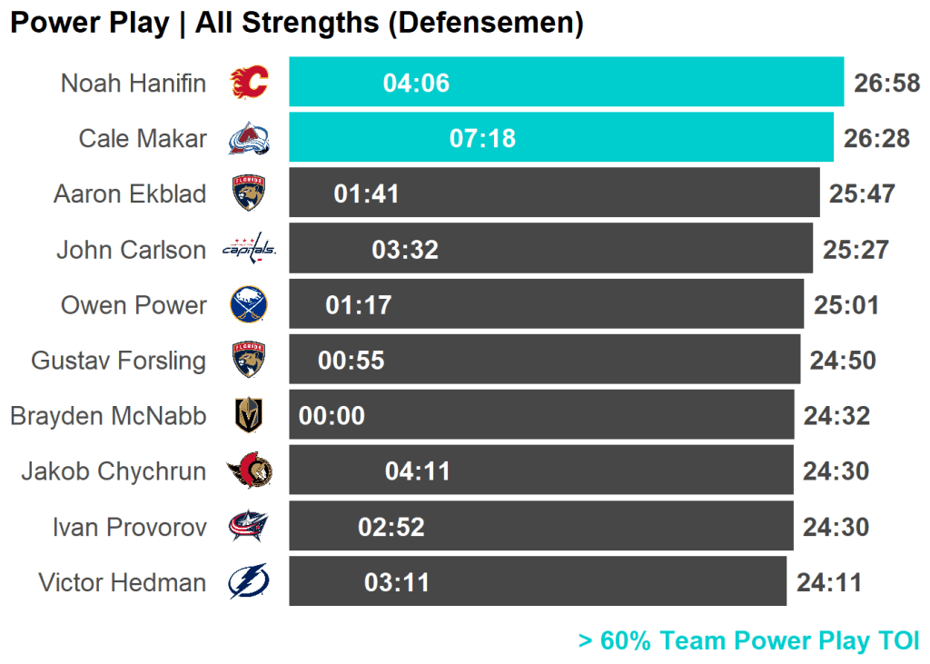 | Noah Hanifin | Calgary Flames | 04:06 | 68.3 | 27.2 | 41.1 |