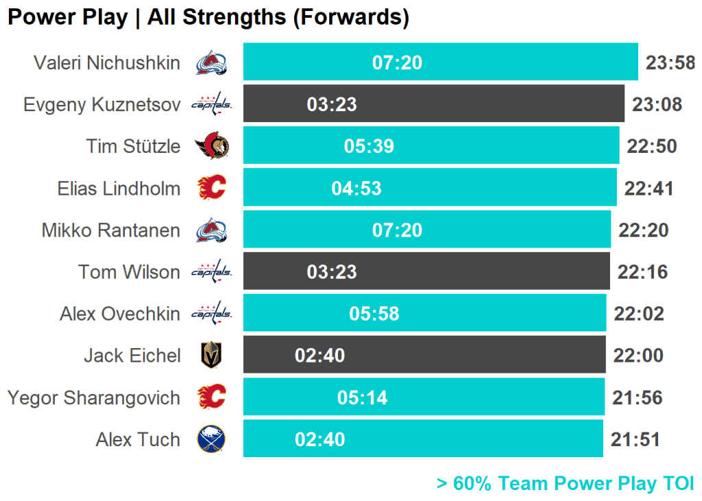 | Yegor Sharangovich | Calgary Flames | 05:14 | 87.2 | 45.7 | 41.6 |