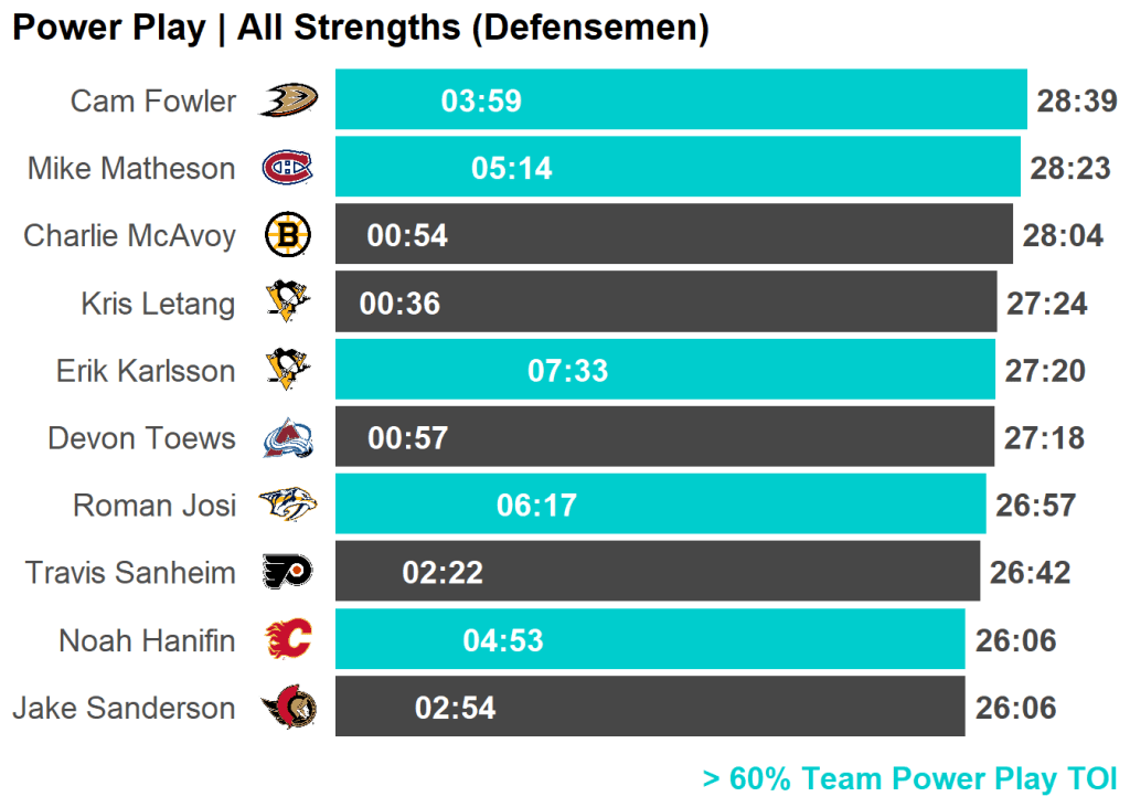 | Cam Fowler | Anaheim Ducks | 03:59 | 77.8 | 50.4 | 27.4 |