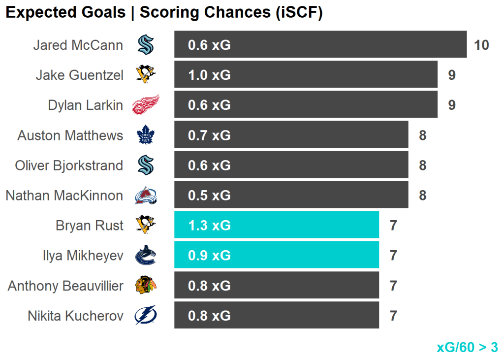 | Skater | Team | Shots | Shots/60 | Chances | xGoals |