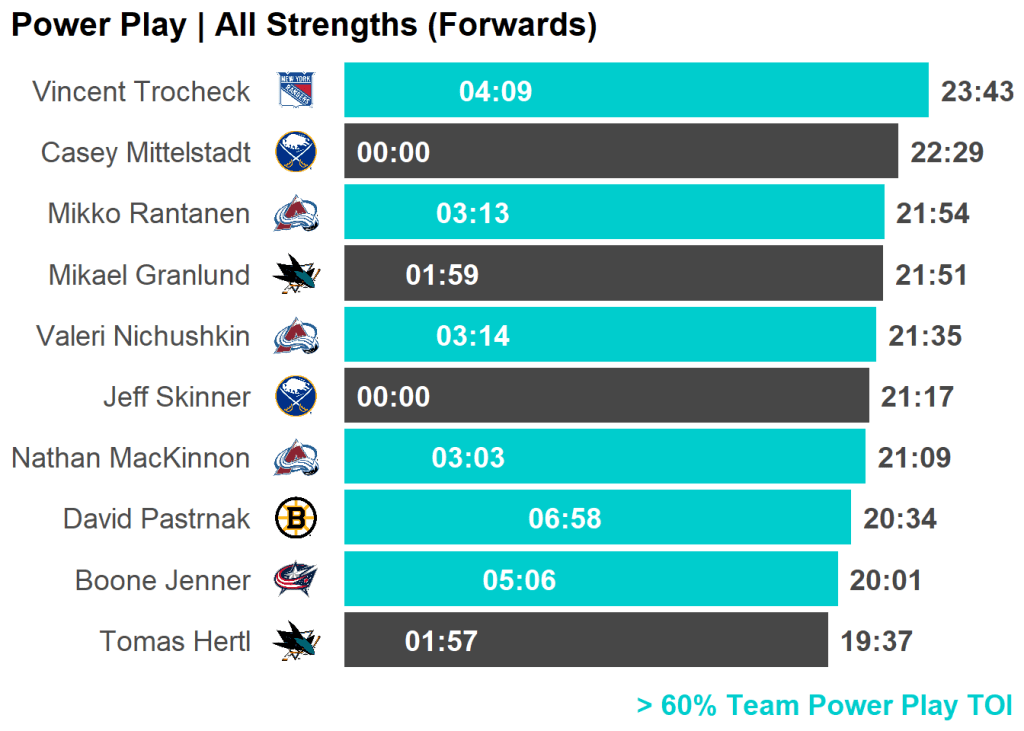 | Skater | Team | PP TOI | Percent | Last 3 GP | Difference |
