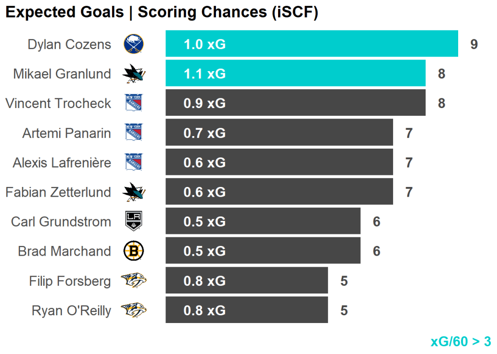 | Skater | Team | Shots | Shots/60 | Chances | xGoals |
