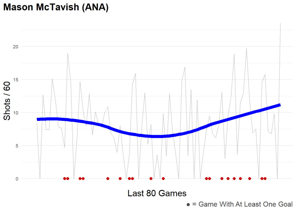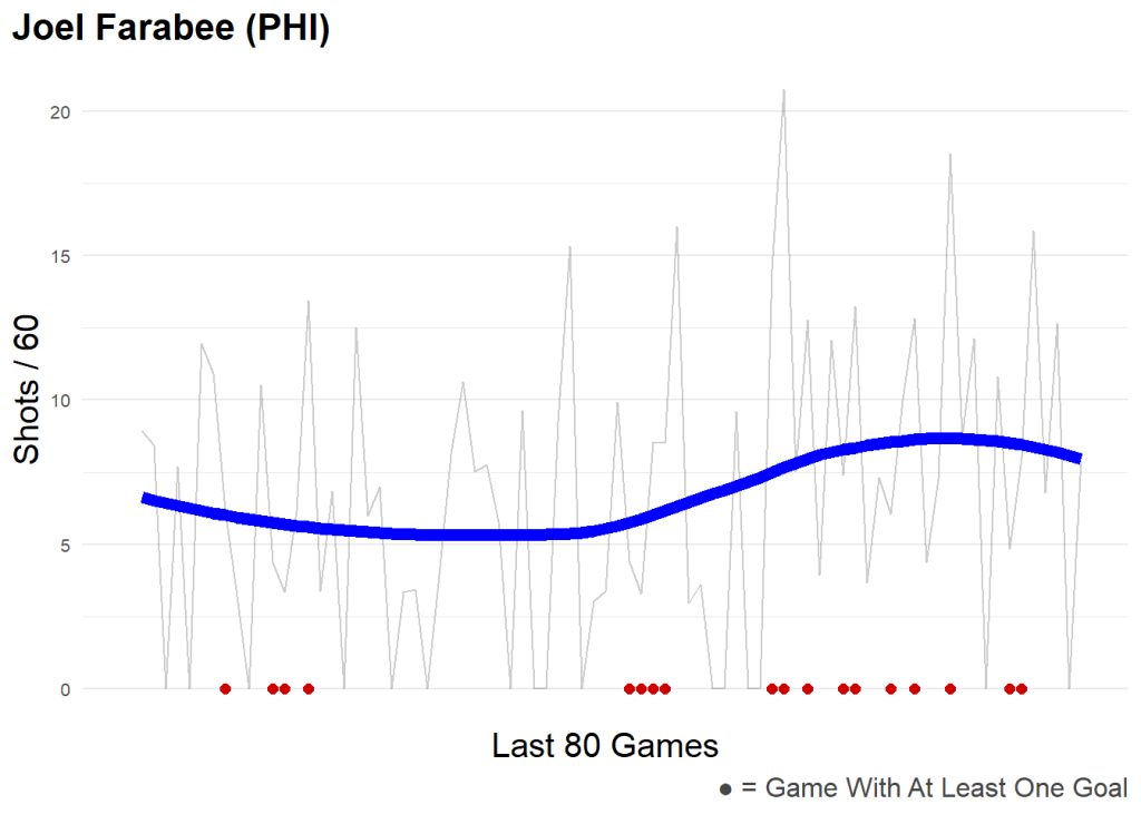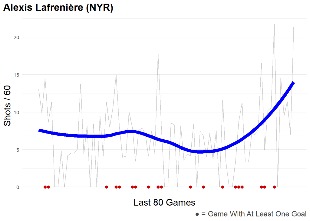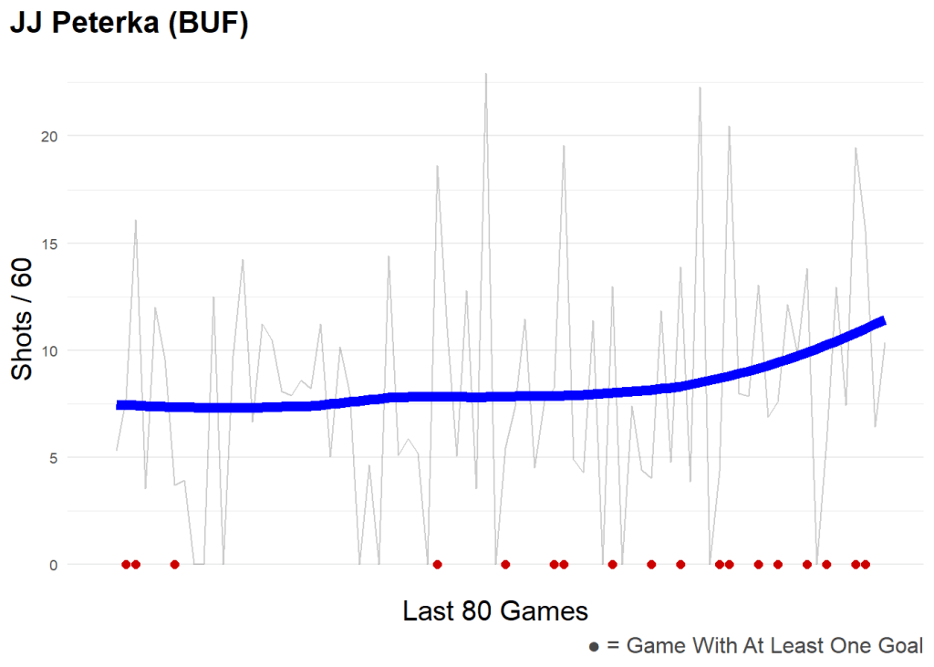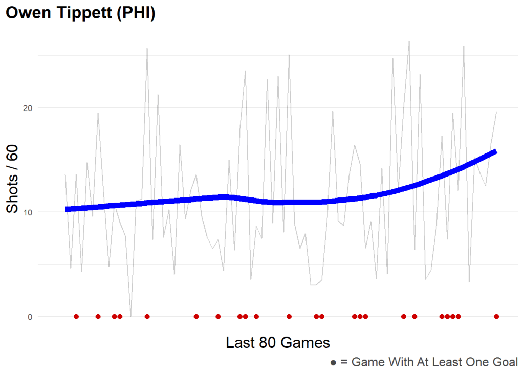 Under-26 skaters with a rising shot rate in the last 20 GP versus the last 80 GP.