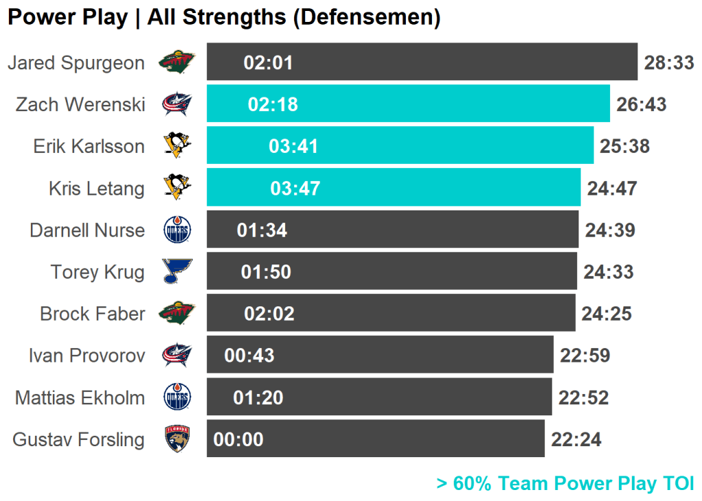 | Justin Faulk | St. Louis Blues | 6 | 18.03 | 2 | 0.27 |