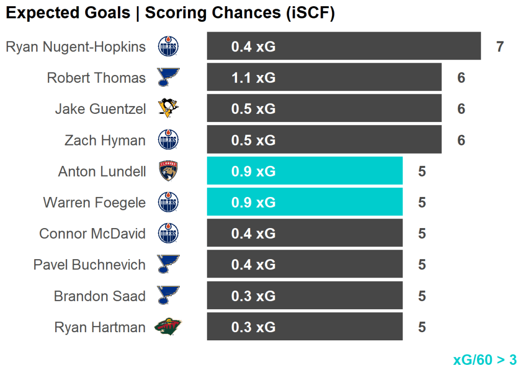 | Skater | Team | Shots | Shots/60 | Chances | xGoals |