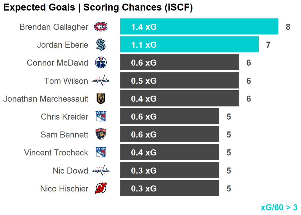 | Jordan Eberle | Seattle Kraken | 4 | 12.41 | 7 | 1.07 |