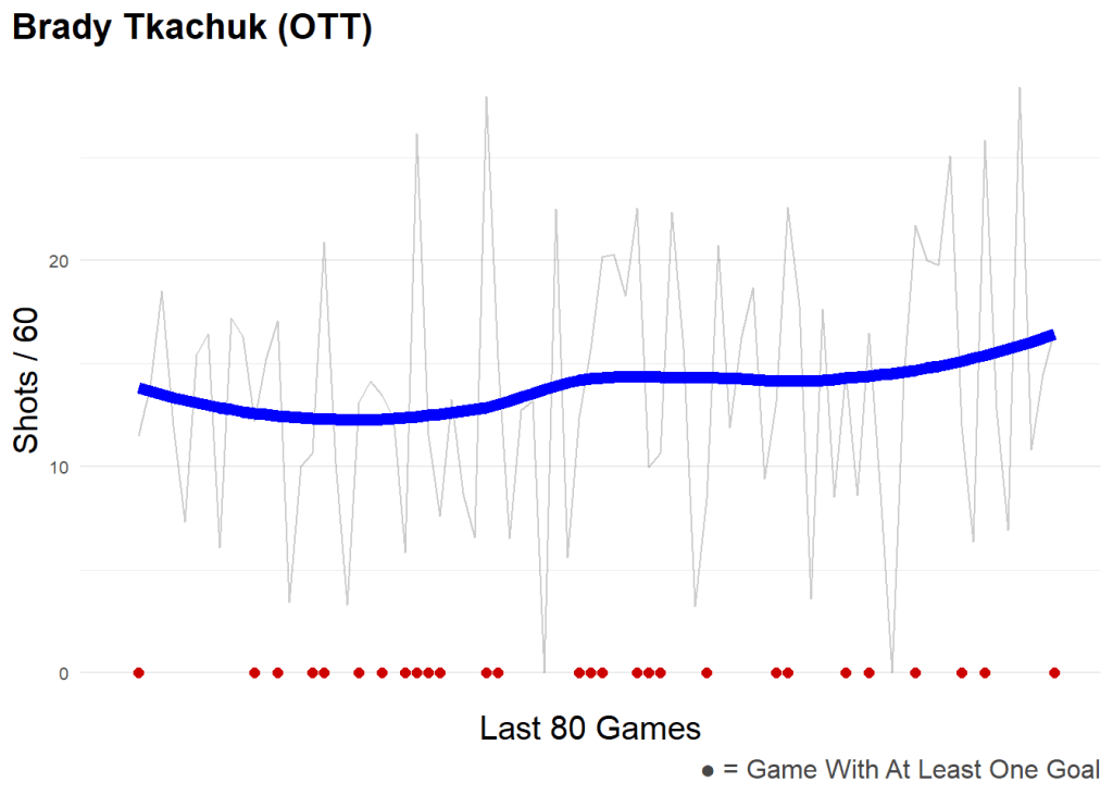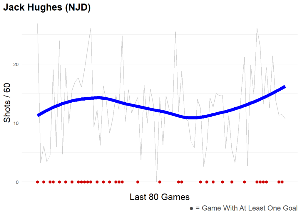 Under-26 skaters with a rising shot rate in the last 20 GP versus the last 80 GP.