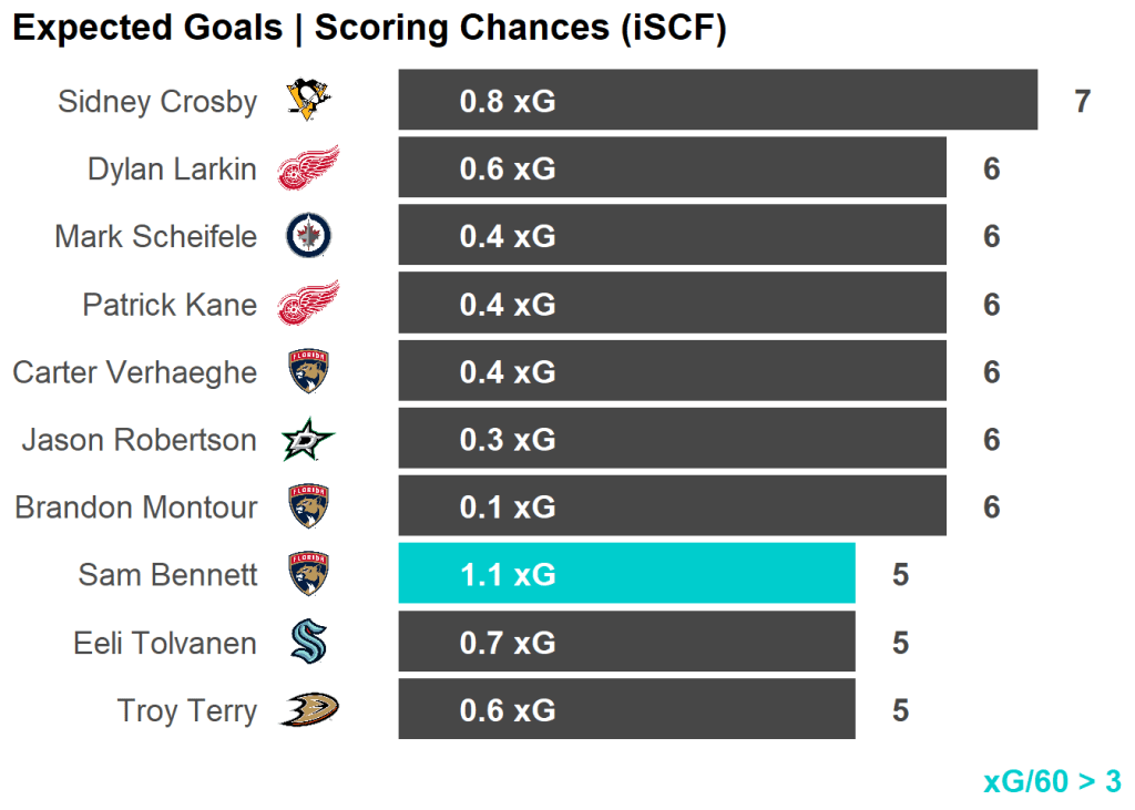 | Sam Bennett | Florida Panthers | 5 | 15.44 | 5 | 1.09 |