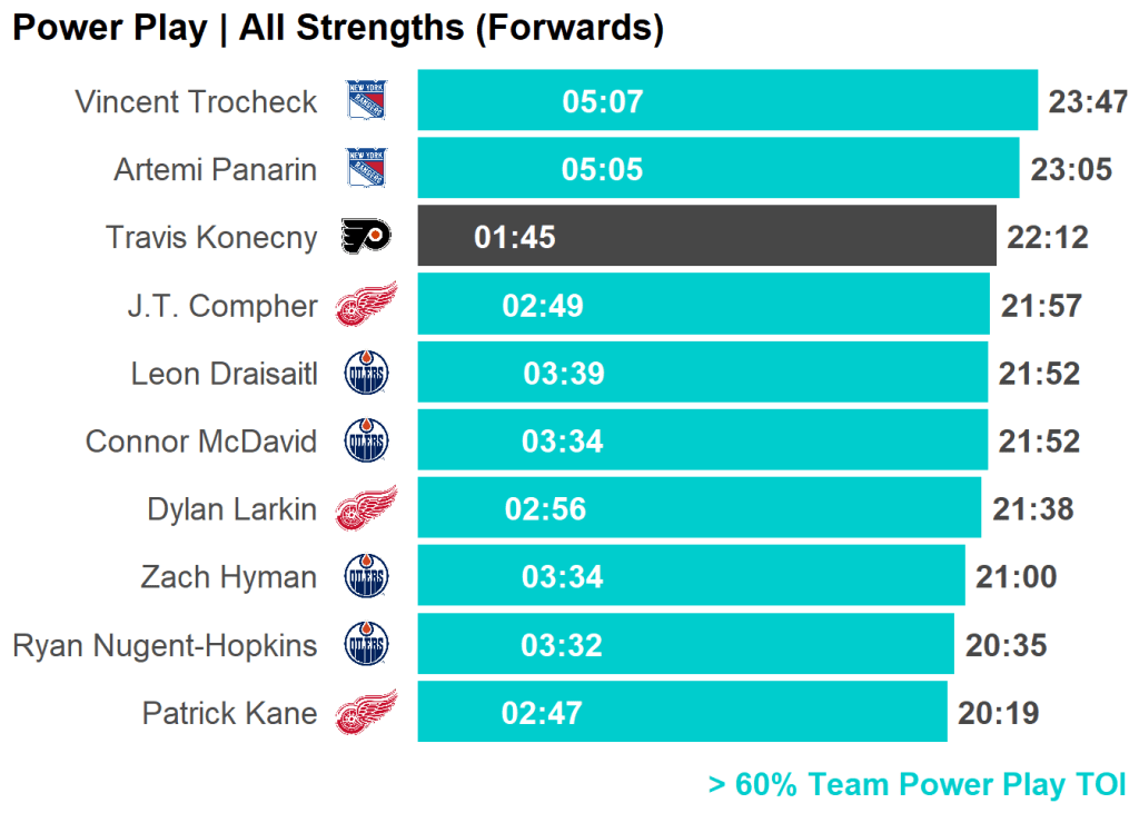 | Travis Konecny | Philadelphia Flyers | 4 | 10.81 | 3 | 0.27 |