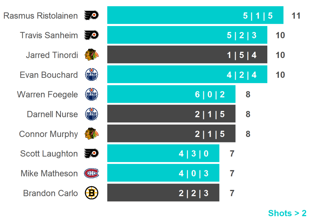 | Rasmus Ristolainen | Philadelphia Flyers | 5 | 13.37 | 3 | 0.16 |