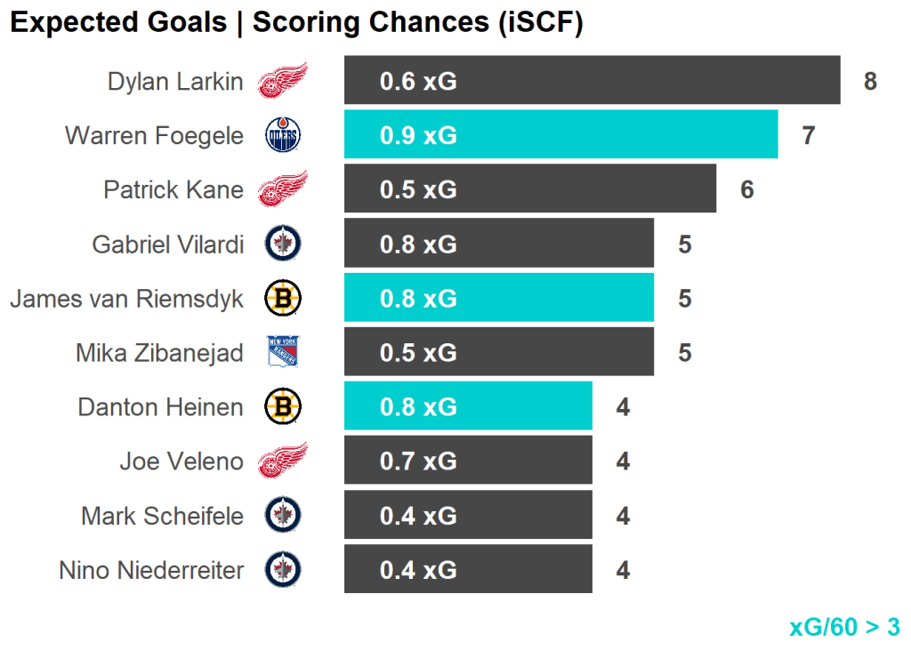 | Skater | Team | Shots | Shots/60 | Chances | xGoals |