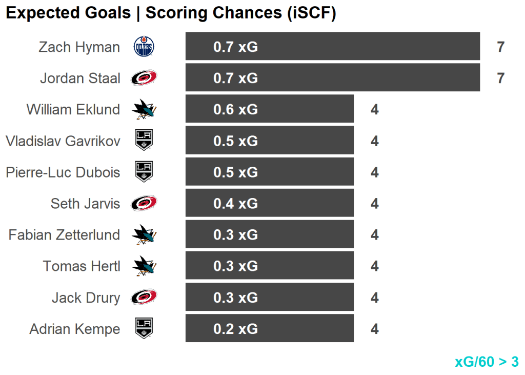 | Skater | Team | Shots | Shots/60 | Chances | xGoals |