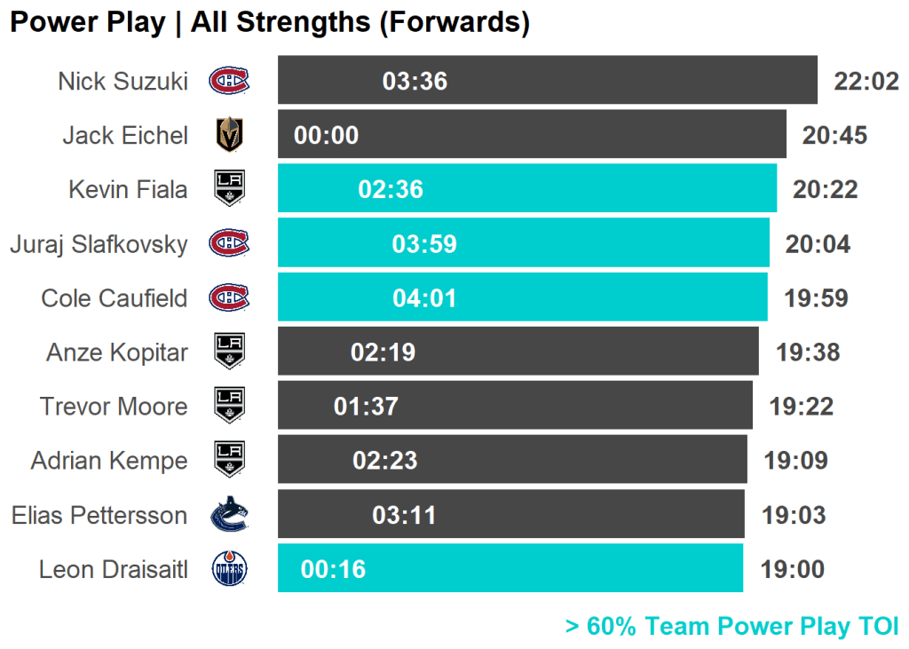 | Skater | Team | PP TOI | Percent | Last 3 GP | Difference |