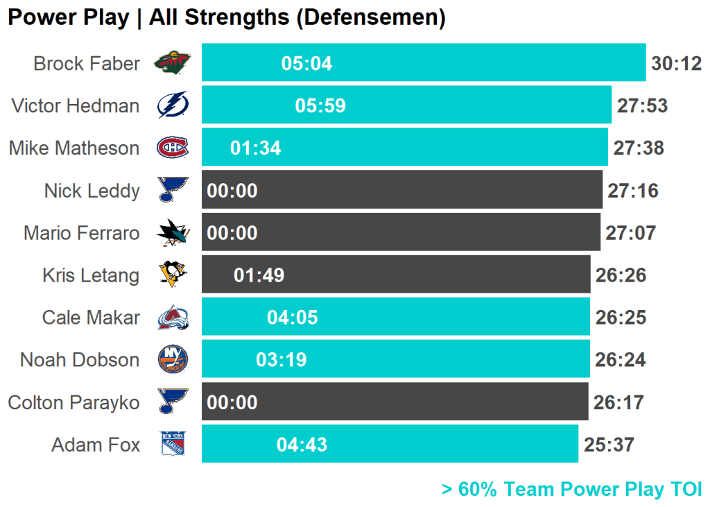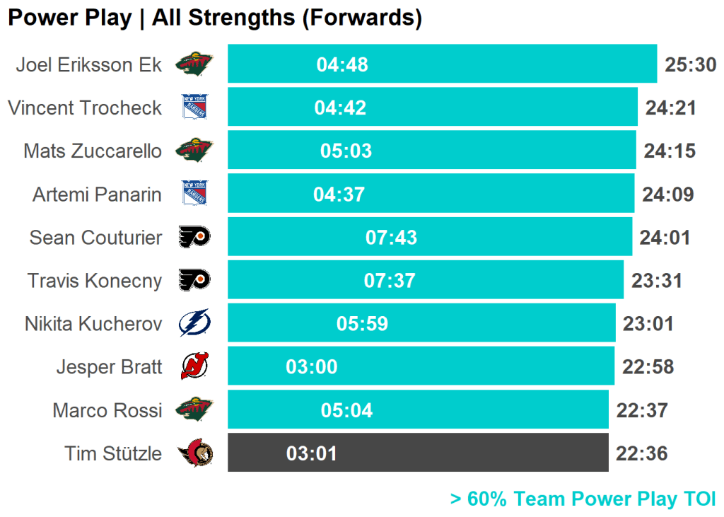 | Skater | Team | PP TOI | Percent | Last 3 GP | Difference |