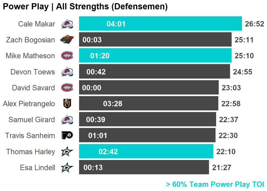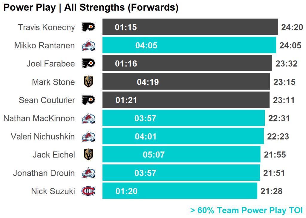 | Nathan MacKinnon | Colorado Avalanche | 7 | 18.65 | 2 | 0.49 |
