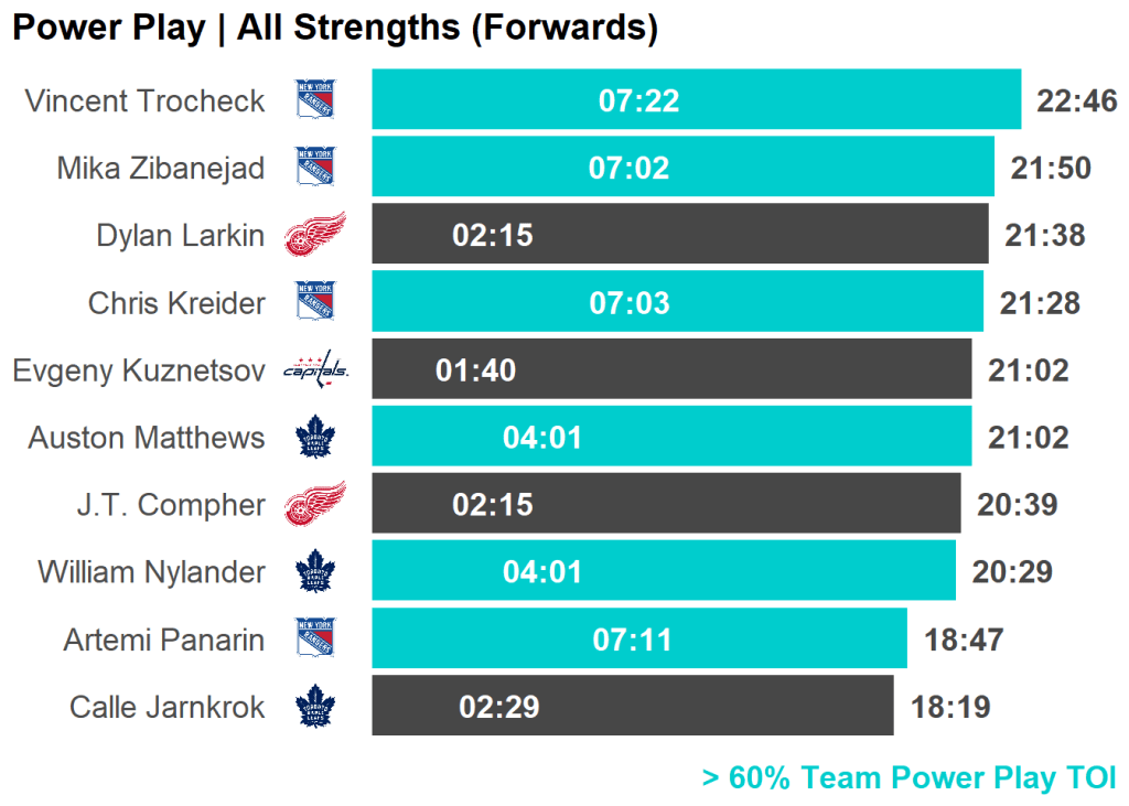 | Skater | Team | PP TOI | Percent | Last 3 GP | Difference |