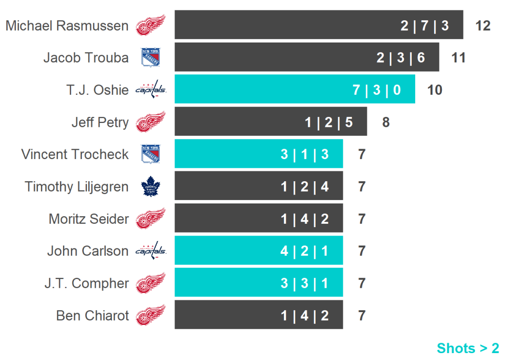 | T.J. Oshie | Washington Capitals | 7 | 25.33 | 9 | 1.19 |