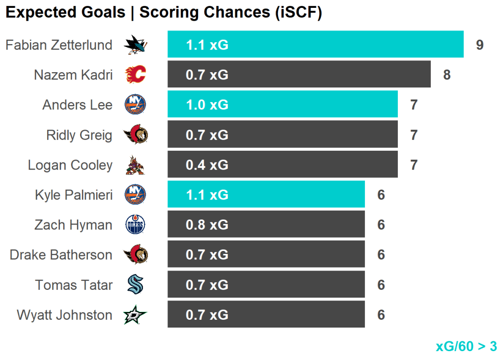 | Skater | Team | Shots | Shots/60 | Chances | xGoals |
