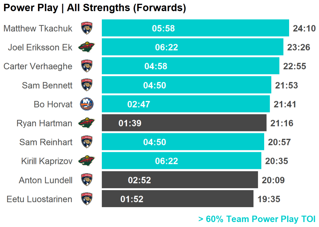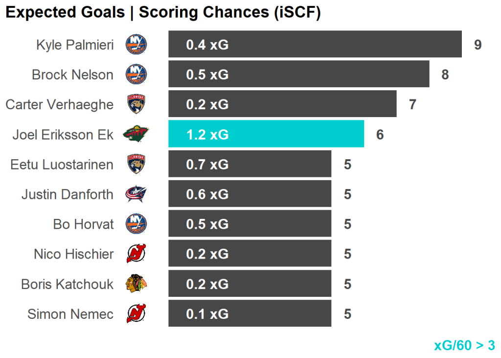 | Joel Eriksson Ek | Minnesota Wild | 6 | 15.36 | 6 | 1.18 |
