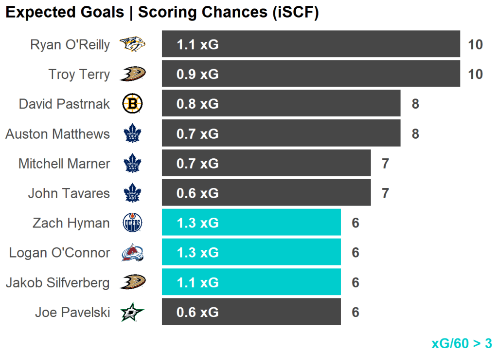 | Skater | Team | Shots | Shots/60 | Chances | xGoals |