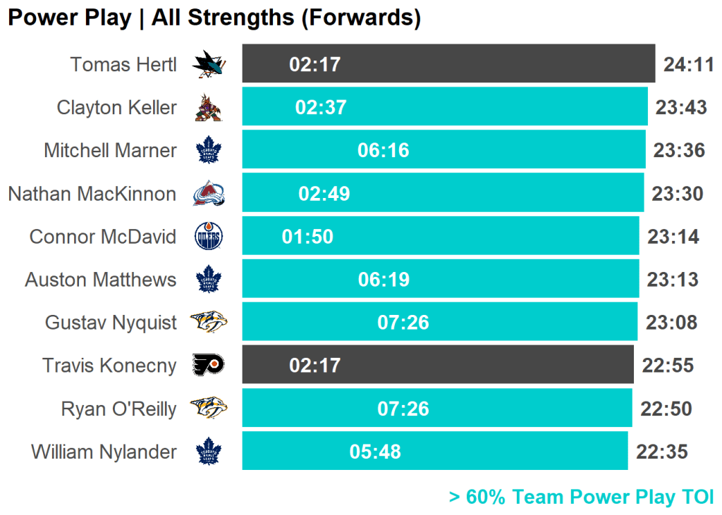 | Skater | Team | PP TOI | Percent | Last 3 GP | Difference |
