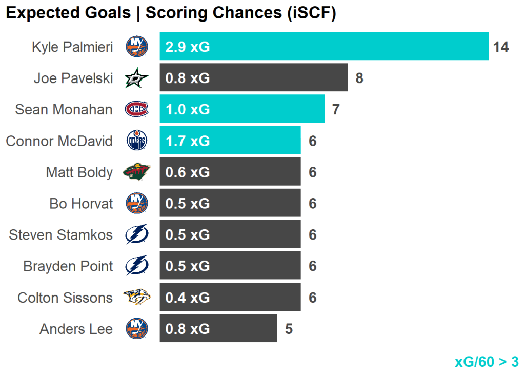 | Kyle Palmieri | New York Islanders | 11 | 34.26 | 14 | 2.86 |